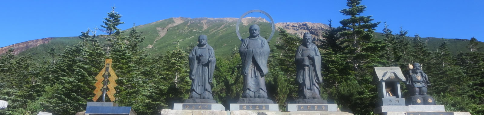 古来、御嶽山に登山するには、麓で百日間の精進潔斎の修行をしてから登拝したのですが、天明2年(1.782年)に覚明行者が黒沢口登山道を、寛政4年 (1,792年)に普寛行者が王滝口登山道をそれぞれ開き、講社を作り軽精進潔斎で盛んに登山を奨励しました。一心行者、一山行者もこの跡を継ぎ、数多の行者達が相継いで霊峰の尊き導きを得てご神徳を授かり、ご霊験あらたかなことが全国に広まり現在に至ります。
